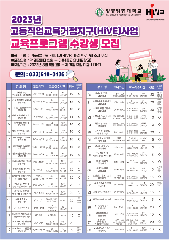 ● 2023년 고등직업교육거점지구(HiVE)사업 교육프로그램 일정이 업데이트 되었습니다. 첨부파일을 확인 바랍니다.